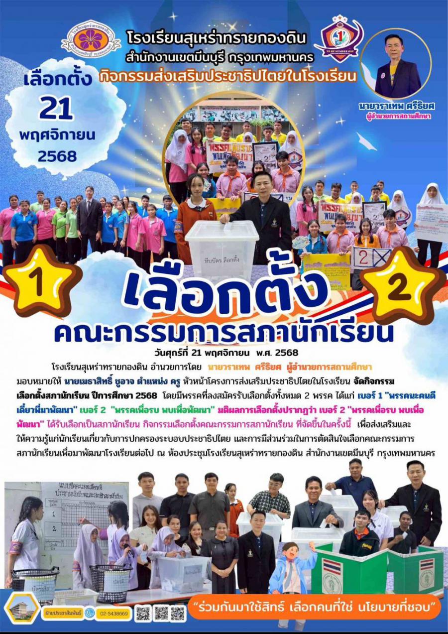 วันศุกร์ที่ 21 พฤศจิกายน พ.ศ. 2568 โรงเรียนสุเหร่าทรายกองดิน อำนวยการโดย นายวราเทพ ศรีธิยศ ผู้อำนวยการสถานศึกษา มอบหมายให้ นายเมธาสิทธิ์ ชูอาจ ตำแหน่ง ครู หัวหน้าโครงการส่งเสริมประชาธิปไตยในโรงเรียน จัดกิจกรรมเลือกตั้งสภานักเรียน ปีการศึกษา 2568 โดยมีพรรคที่ลงสมัครรับเลือกตั้งทั้งหมด 2 พรรค ได้แก่ เบอร์ 1 S:0