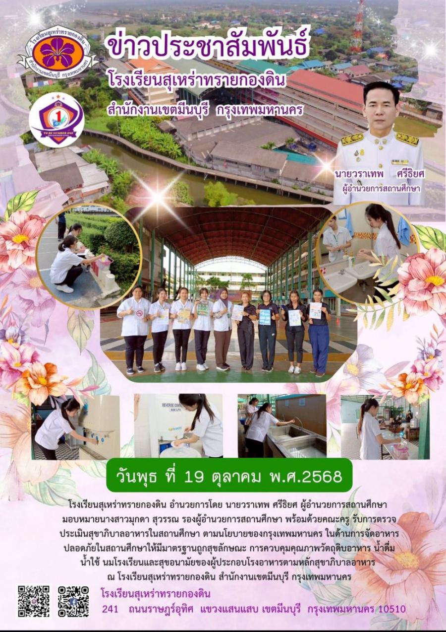 วันพุธ ที่ 19 พฤศจิกายน พ.ศ. 2568 โรงเรียนสุเหร่าทรายกองดิน อำนวยการโดย นายวราเทพ ศรีธิยศ ผู้อำนวยการสถานศึกษา มอบหมายนางสาวมุกดา สุวรรณ รองผู้อำนวยการสถานศึกษา พร้อมด้วยคณะครู รับการตรวจประเมินสุขาภิบาลอาหารในสถานศึกษา ตามนโยบายของกรุงเทพมหานคร ในด้านการจัดอาหารปลอดภัยในสถานศึกษาให้มีมาตรฐานถูกสุขลักษณะ การควบคุมคุณภาพวัตถุดิบอาหาร น้ำดื่ม น้ำใช้ นมโรงเรียนและสุขอนามัยของผู้ประกอบโรงอาหารตามหลักสุขาภิบาลอาหาร ณ โรงเรียนสุเหร่าทรายกองดิน สำนักงานเขตมีนบุรี กรุงเทพมหานคร S:0