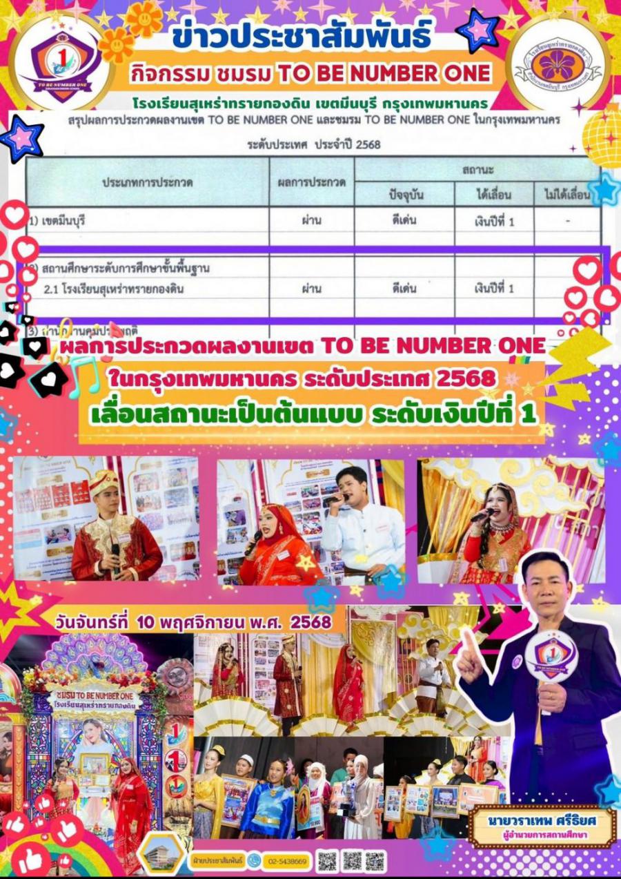 ชมรม TO BE NUMBER ONE โรงเรียนสุเหร่าทรายกองดิน ได้เข้าร่วมการประกวดนำเสนอผลการดำเนินงานชมรม TO BE NUMBER ONE ในสถานศึกษาประเภทการศึกษาขั้นพื้นฐาน ระดับประเทศ เมื่อวันที่ 13-15 กรกฎาคม 2568 ณ อิมแพค ฟอรั่ม เมืองทองธานี โอกาสนี้ ได้ผ่านการประเมิน เลื่อนสถานะเป็นกลุ่มรักษามาตรฐาน ?เป็นต้นแบบ ระดับเงิน ปีที่ 1 ?ประจำปี 2568 S:0